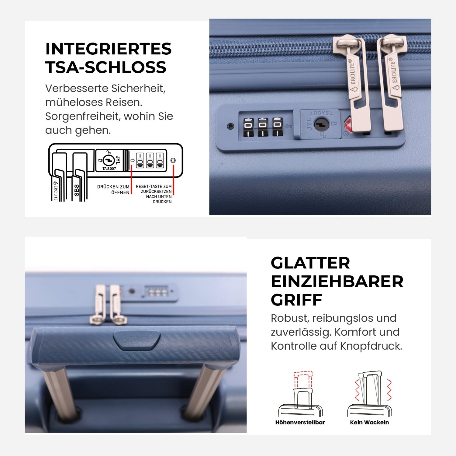 - TSA-zugelassenes Schloss: Das integrierte TSA-Kombinationsschloss schützt Ihr Gepäck und ermöglicht Sicherheitskontrollen am Flughafen ohne Beschädigung.
