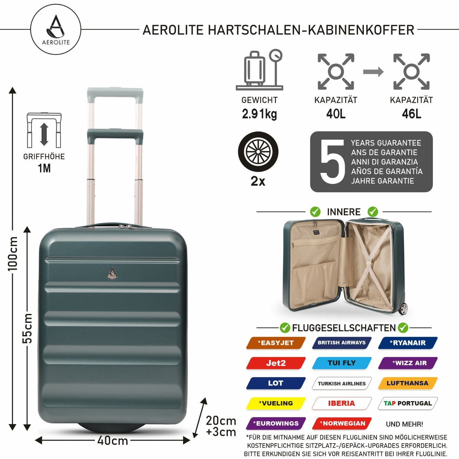 Aerolite Erweiterbarer Kabinenkoffer 55x40x20cm – Ryanair Priority Maximalgröße, erweiterbar auf 55x40x23cm für Lufthansa & Wizz Air Priority, Hartschalen-Handgepäck-Trolley mit 2 Rollen und TSA-Schloss, 40–46L Fassungsvermögen, Waldgrün