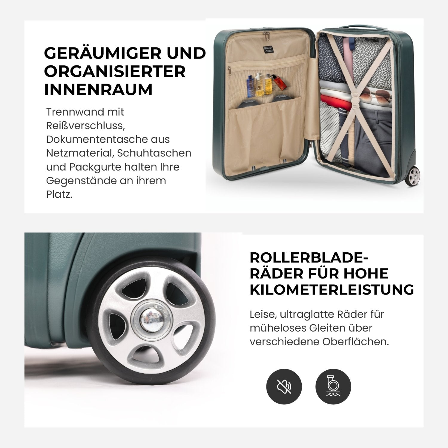 • Sanftes 2-Rollen-System: Ausgestattet mit Rollen im Rollerblade-Stil für leises und müheloses Rollen sowie einem stabilisierenden Ständer, der den Koffer beim Warten oder Umsteigen aufrecht hält.