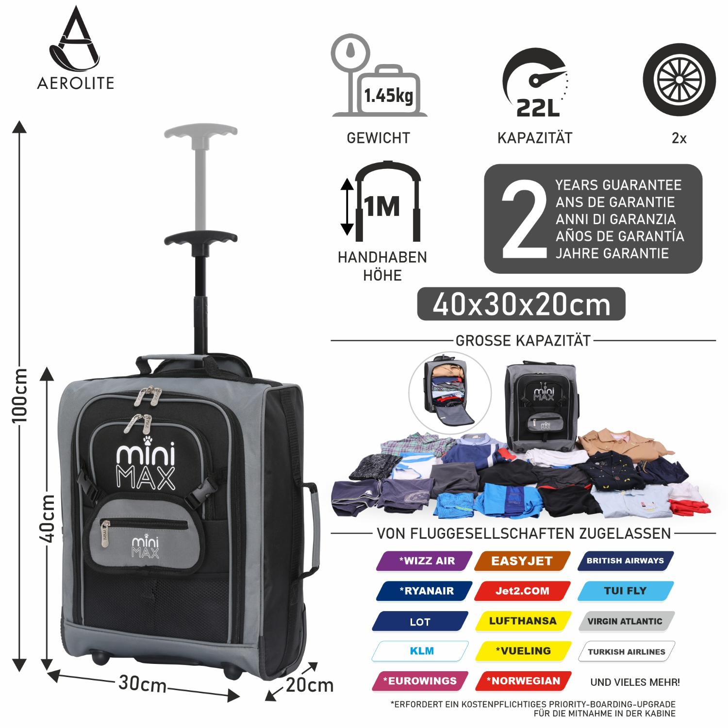Aerolite MiniMAX 20L 40x30x20cm Ryanair/Wizz Air Maximale Größe Kabine Handgepäck unter Sitz Trolley Rucksack tragen auf Kabine Handgepäck Tasche 2 Rad (schwarz)