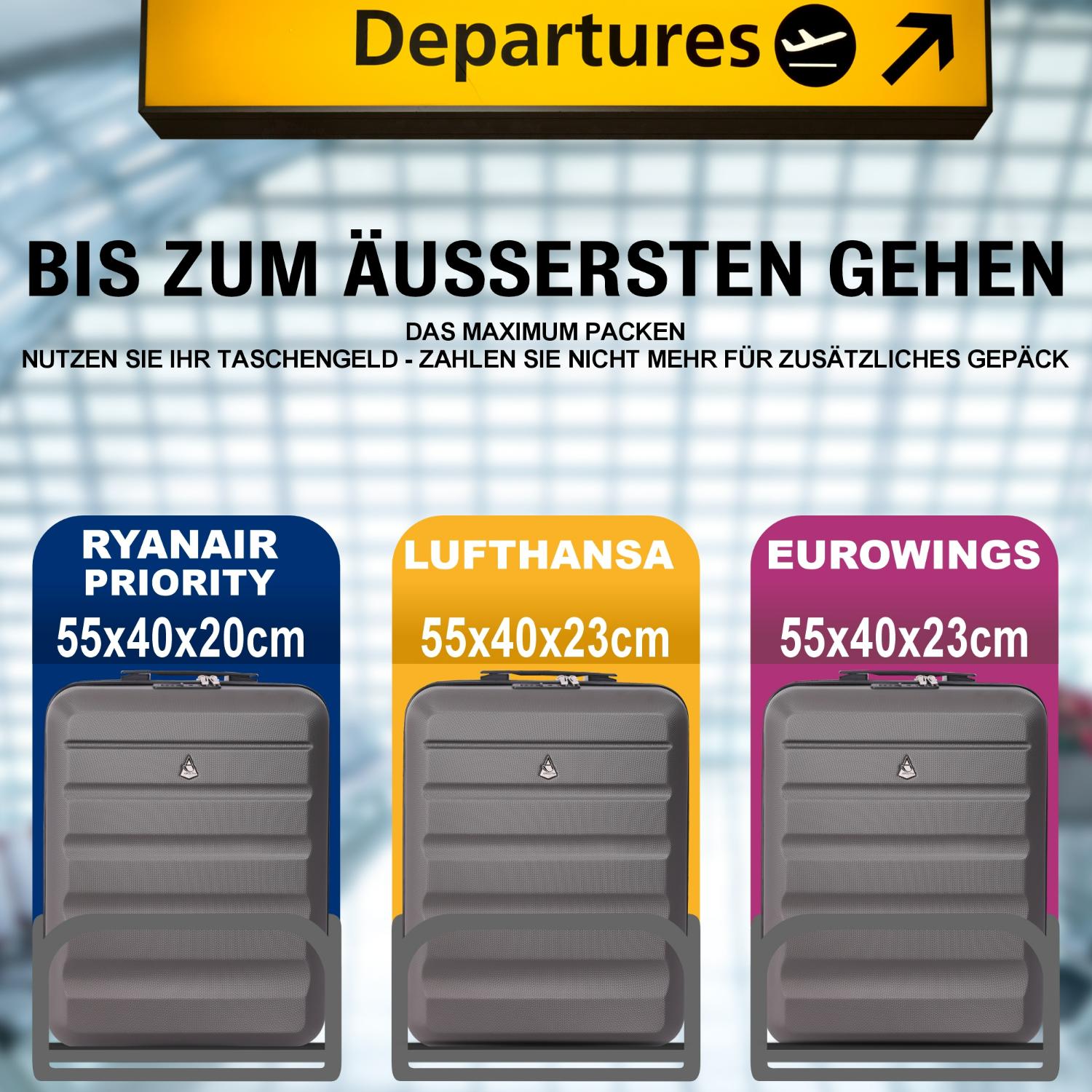 - MAXIMALE GRÖSSE DES KOFFERS FÜR DAS UPGRADE – Das Set beinhaltet außerdem einen 55x40x20 Hartschalenkoffer für Passagiere, die ein Ryanair Priority Cabin Upgrade gebucht haben. Er ist ebenfalls passend für viele der beliebtesten Fluggesellschaften in Europa – darunter TAP Portugal, TUI, Vueling und viele weitere! Maße: 55x40x20 cm (eingefahren, inkl. Rollen & Griff), 50x40x20 cm (ohne Rollen & Griff), Höhe (ausgezogener Griff): 1 m, Gewicht: 2,75 kg, Volumen: 40 L